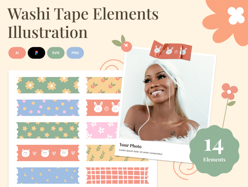 Cute Washi Tape Elements Illustration is a digital product crafted to elevate your design projects with an infusion of charm and playfulness. This collection, compatible with Adobe Illustrator, Figma, SVG, and PNG formats, offers a delightful array of cute tape elements that seamlessly integrate into your digital creations.
